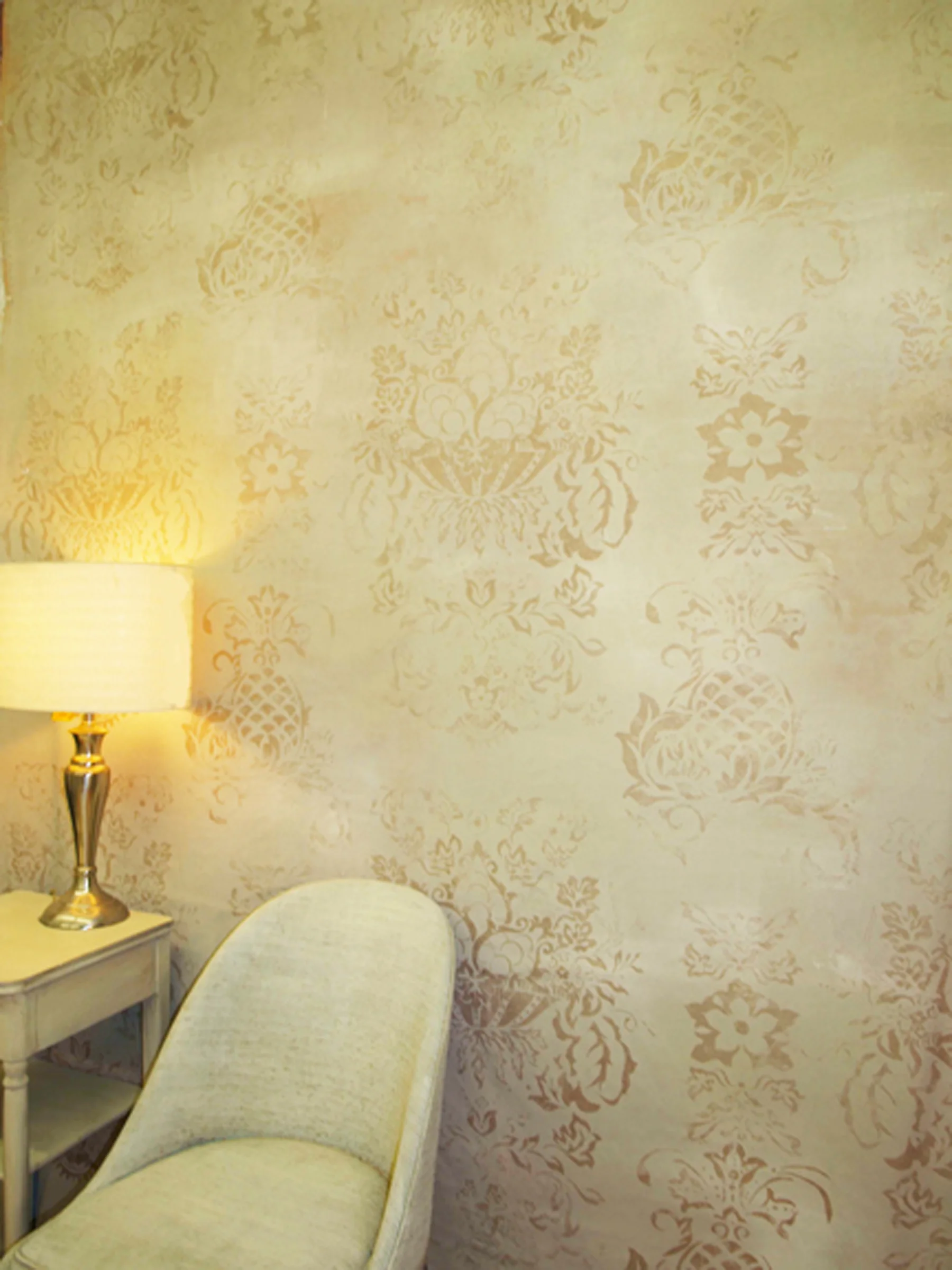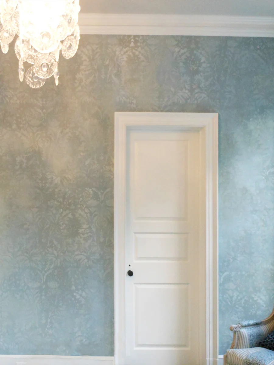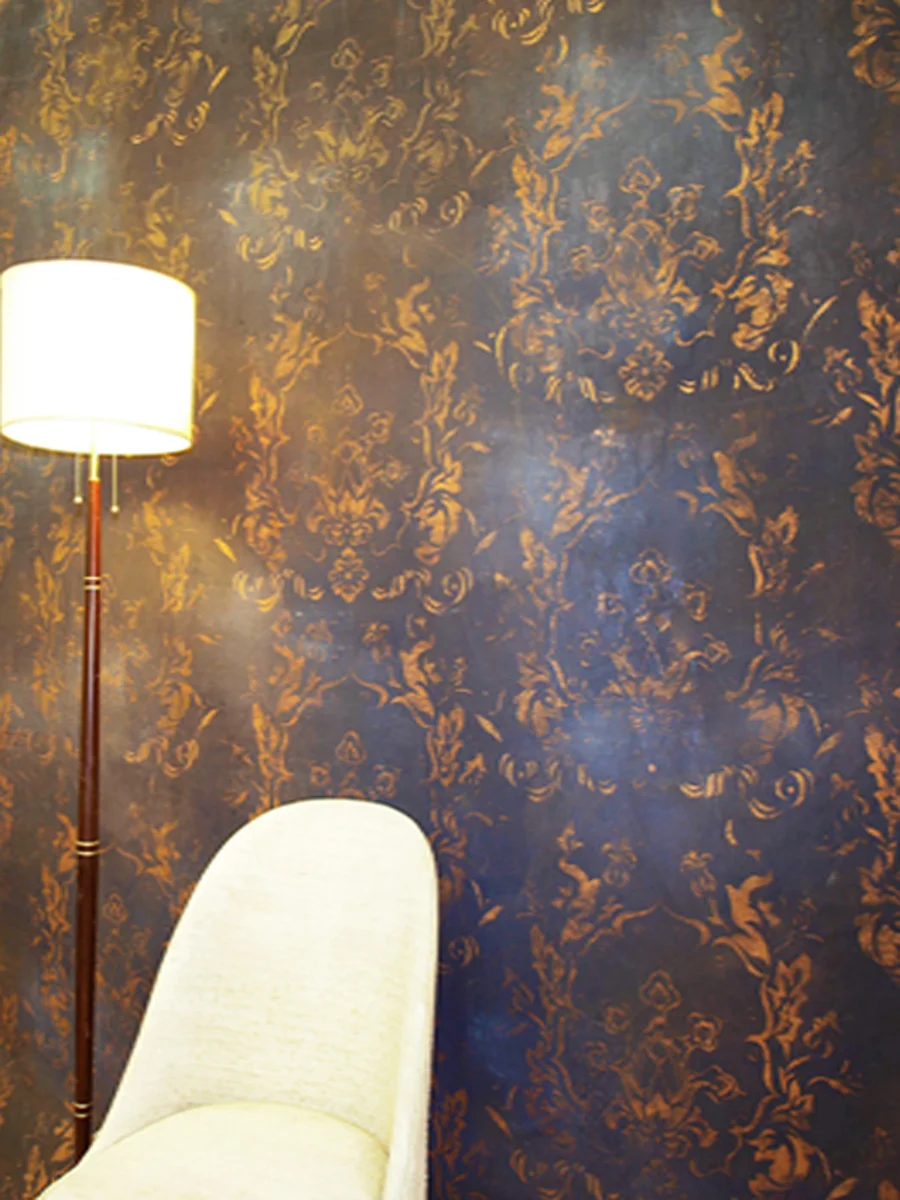 We start with a blank canvas and layer up various shades of color. When the tone and depth are right, we begin the process of hand printing patterns from our various collections. The results are dimensional, expansive and gorgeous. Each project is completely unique for each client.